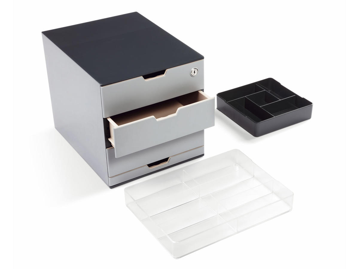 Skuffeboks til opbevaring af tilbehør til kaffe og te for det lille køkken, mobile arbejdsplads eller mødelokale. Tre skuffer i XXL-format, af hvilke den øverste er låsbar, med ekstra stort opbevaringsrum og en lille skuffe til opbevaring af bakke. Skuffer integrerer alle tilbehør. Leveres med kasse Coffee Point Case (varenr. 394133) og skuffe indsats Caddy (varenr. 394131). Godkendt til fødevarekontakt og tåler maskinopvask. Skufferne er forsynet med udtræksstop og fingerhul. Skridsikre gummifødder på undersiden. Mål: HxBxD 280x292x356 mm