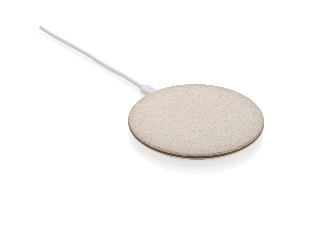 Ultra flad 5W trådløs oplader til opladning af trådløse enheder. Lavet af naturligt hvedestrå (35%) blandet med ABS. LED indikator lyser når enheden lader. Kompatibel med all QI enheder så som Android nyeste generationer samt iPhone 8 og nyere. Indgang: 5V/1,2A. Trådløs udgang: 5V/1A, 5W. Leveres med 150 cm langt PVCfrit TPE-kabel type Micro USB.