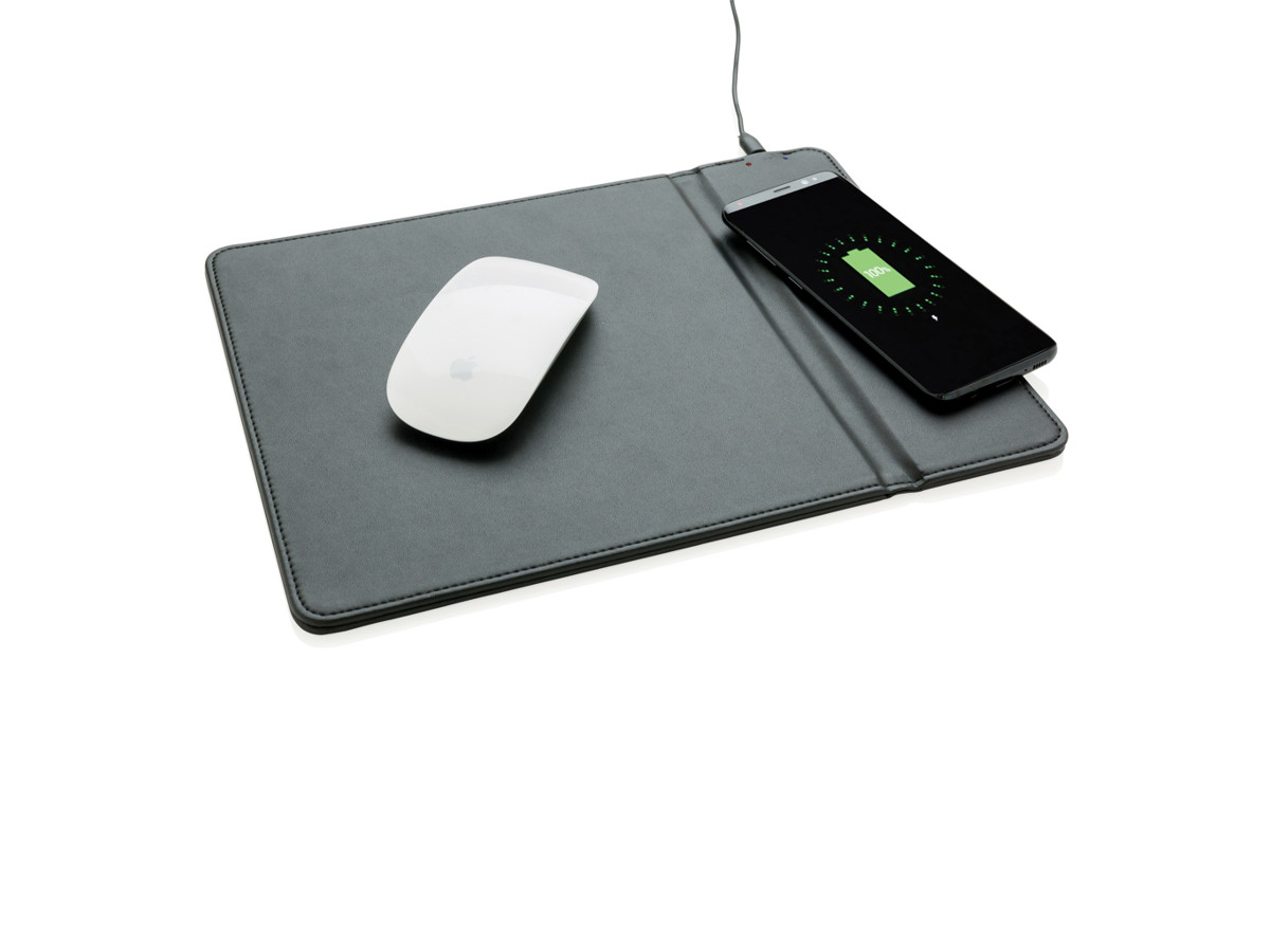 PU mussemåtte med integreret trådløs opladnings pad til at lade alle telefoner der understøtter denne teknologi (Android seneste generationer samt iPhone8 eller nyere). Den trådløse enhed kan også anvendes som stander til din mobiltelefon. Inklusive 40 cm langt micro USB kabel så du kan tilslutte den til din PC. Input: 5V/1A. Trådløs udgang 5V/1A. 5W.