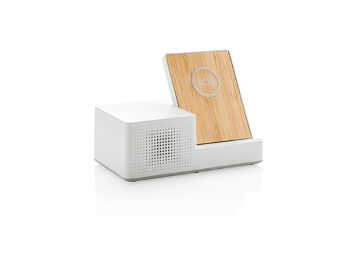 Opdater dit skrivebord med denne superpraktiske trådløse oplader. Fremstillet af ABS og 100 % naturligt bambus lader denne trådløse oplader med højtaler sig integrere perfekt på dit skrivebord eller i din dagligstue. Den trådløse oplader er en 5W oplader og leveres med et 150 cm mikro USB-kabel til at slutte den til din USB-strømkilde. Den 3W trådløse højtaler lader dig streame musik op til 10 meter væk vha. BT 4.1. Ved brug af begge funktioner anbefales det at holde enheden forbundet til en strømkilde. Trådløs opladning kompatibel med alle QI-aktiverede enheder som f.eks. Android seneste generation, iPhone 8 og op. Inklusive 2xUSB til opladning via USB (5V1A max.) Registreret design®