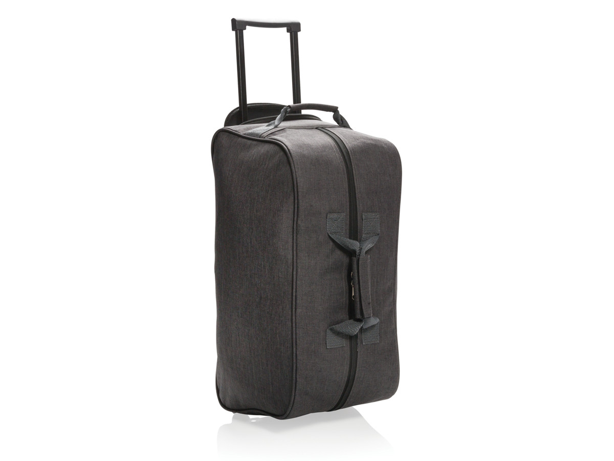 600D slidstærk to-tonet polyester metervare. Med udvidbar trolley system. En frontlomme og en hovedlomme med lynlåslukning.