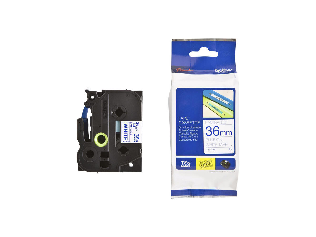 Brother TZe tape 36mmx8m med blå tekst på hvid tape er en del af Brothers unikke, patenterede serie af laminerede P-touch labels. Disse labels er specielt designet til at modstå selv de mest udfordrende miljøer, herunder kulde, varme, vand, syrer, olie, hårdt fysisk slid, og endda direkte sollys.