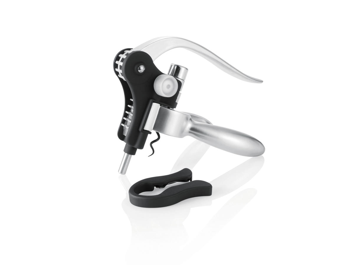 Proptrækker med vægtstangsmekanisme fremstillet af aluminium, hærdet stål og teflonbelagt spiral, inklusive folieskærer og plade med en gennemgang af de bedste vinområder fra 1990.